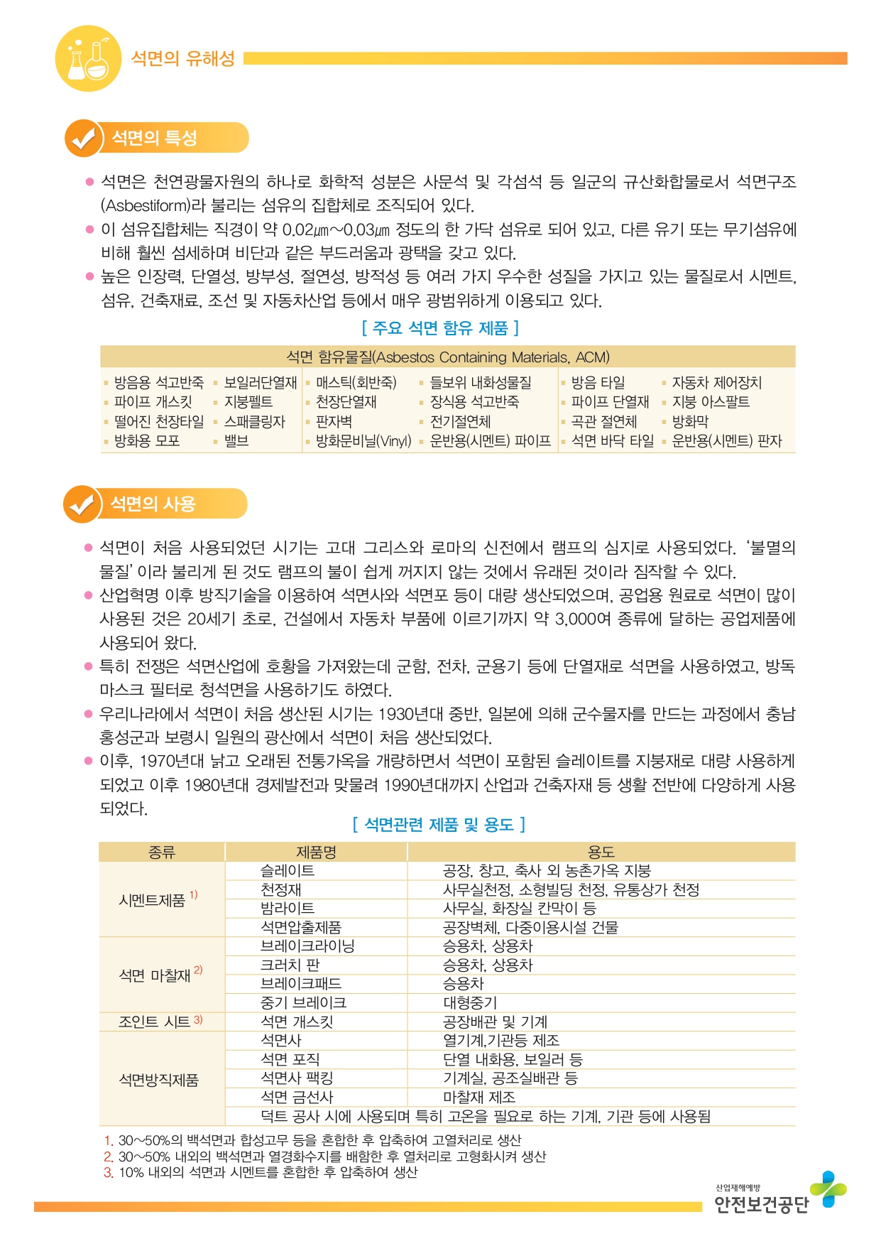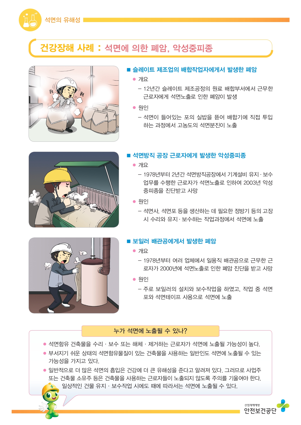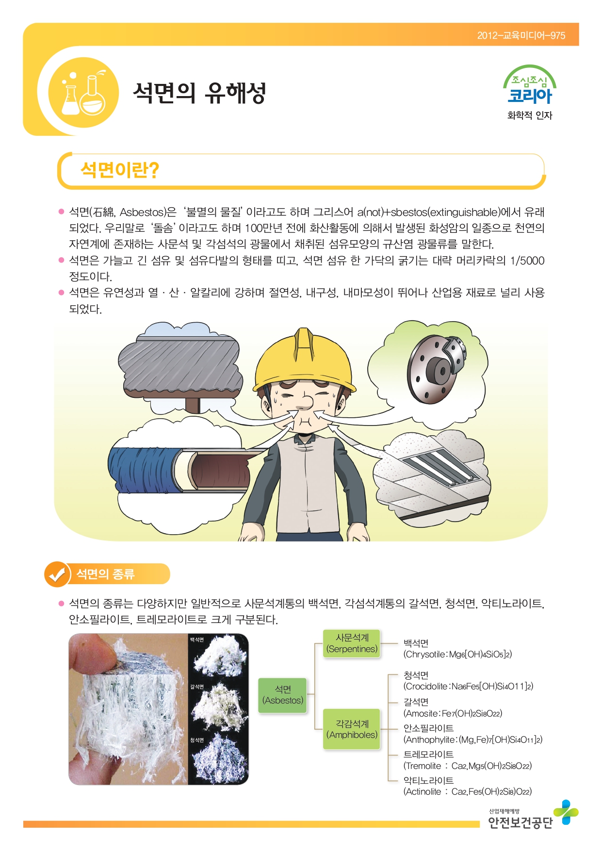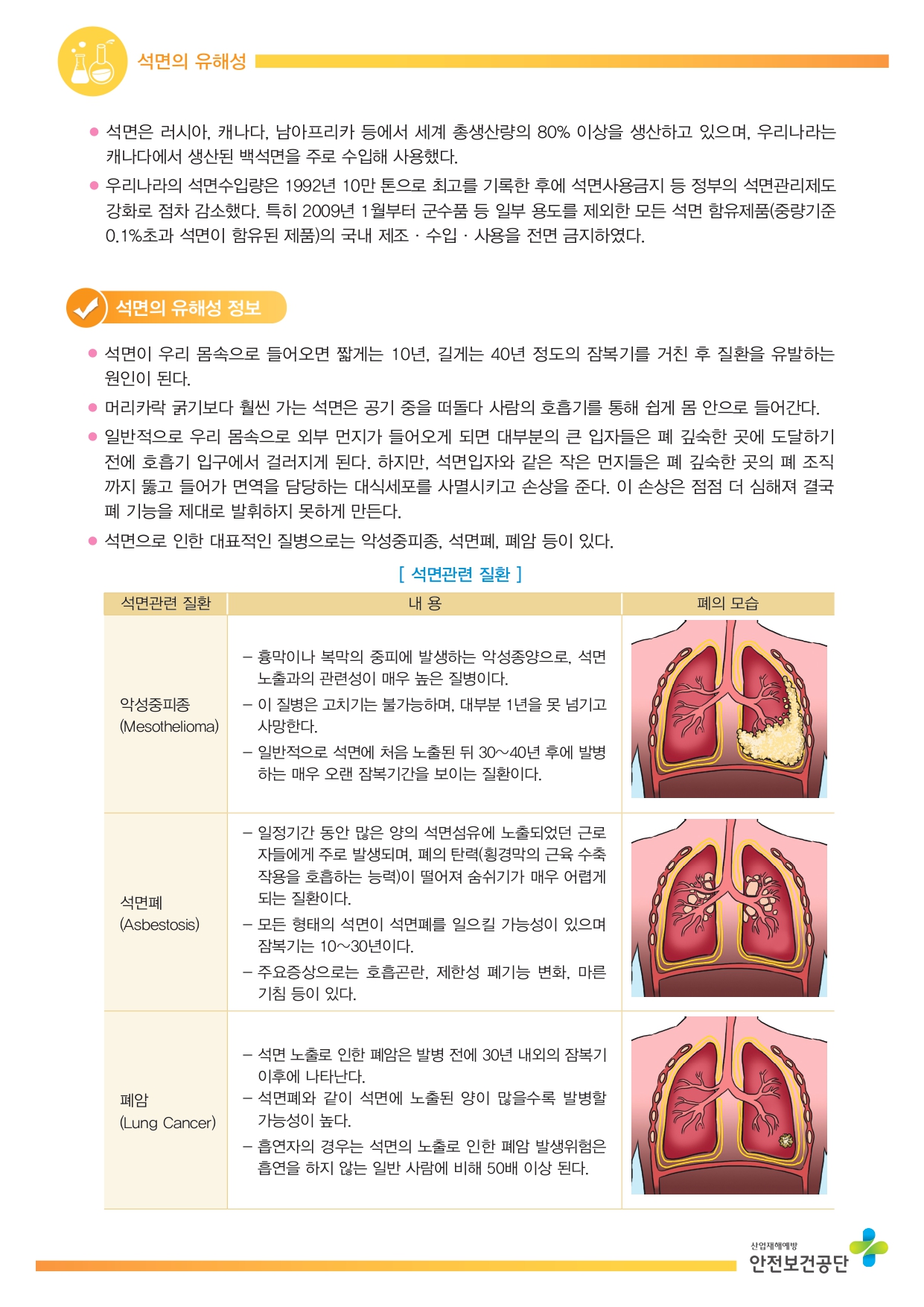 유해·위험성 : 폐암, 악성중피종, 석민폐 등